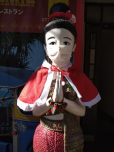 エキゾチックなお店の前には人形があり、彼女たちはマスクをしていました。