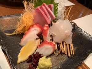まずは新鮮な魚のお刺身3種盛り、天ぷらは春の味覚タラの芽を♬